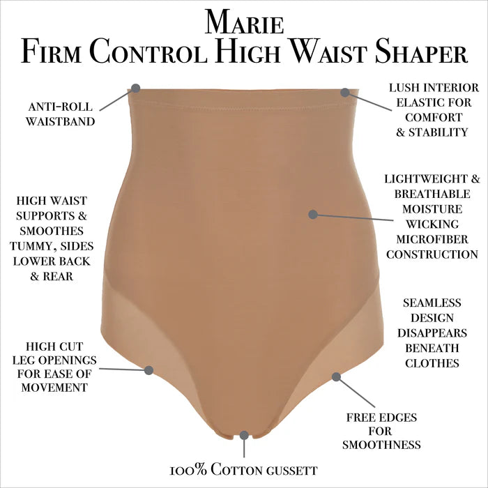Shape your curves and feel supported in this stretchy high waist brief with strong targeted compression at the tummy, waist, and rear, and a lush interior elastic that keeps it securely and comfortably in place. Marie sits right below the bust and features all over coverage for the perfect amount of shaping and smoothing right where you need it most. Constructed of a high-density Lycra blend, this super breathable, silky-smooth brief virtually disappears beneath clothing. Say hello to a smooth, seamless silhouette with Marie!
