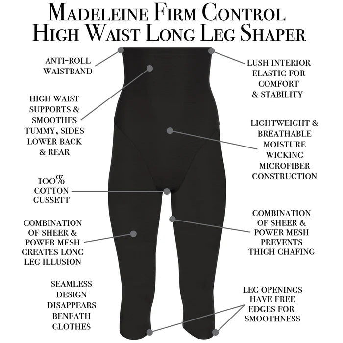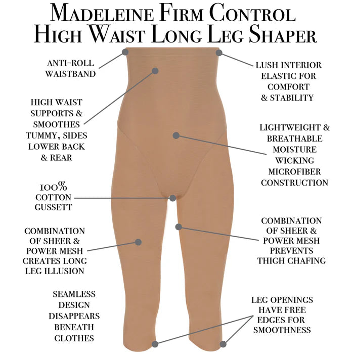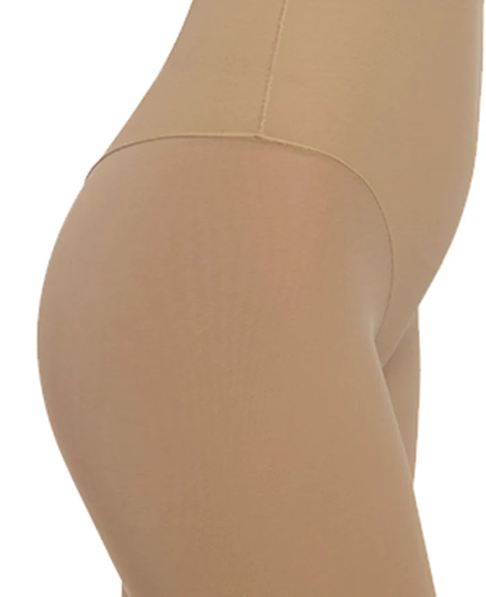 - High waist thigh shaper slims and shapes from ribcage to just above the knee. - Sleek power mesh lined with nylon Lycra targets the most needed areas - Sheer mesh slims and creates a flattering long leg illusion front and back - High waist has smooth finish at top with lush interior elastic for stay-put comfort and stability - Leg openings have free edge for smoothness - Prevents thigh chafing - 100% cotton gusset