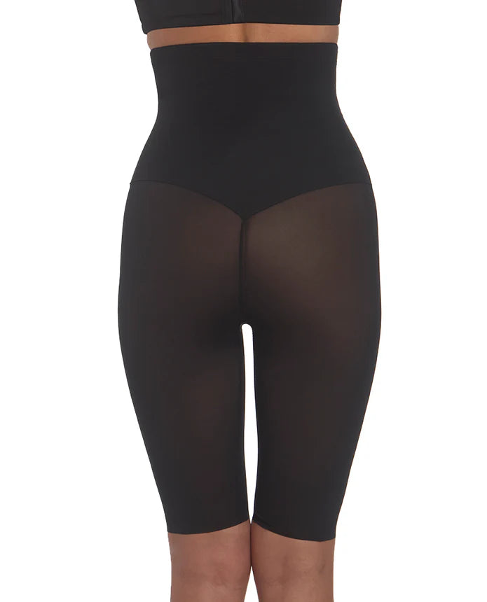 This modern, lightweight and breathable high waist thigh shaper provides firm control and comfort, making it the perfect balance of beauty and functionality. It targets necessary areas with its sleek power mesh, while the sheer mesh creates a flattering silhouette on both the front and back. The high waist has a smooth finish at the top and features lush interior elastic, ensuring comfort and stability. Additionally, the leg openings have free edges for a smooth and chafe-free fit. With a 100% cotton gusset, this shapewear offers a refined and comfortable solution for slimming and shaping from the rib cage to just above the knee.