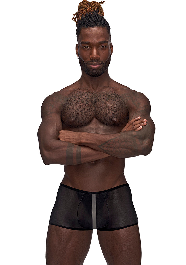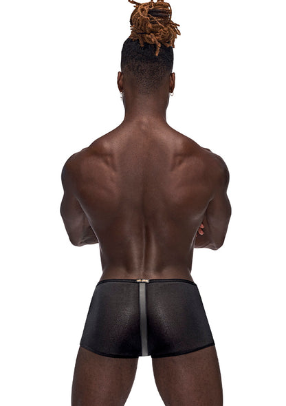 From the Landing Strip collection by Male Power, the Mini Short features thin plush elastic trim on waist and legs, a tone on tone matte onyx insert strip through pouch and rear, and a decorative metallic brand label on rear waistband.