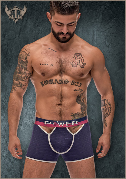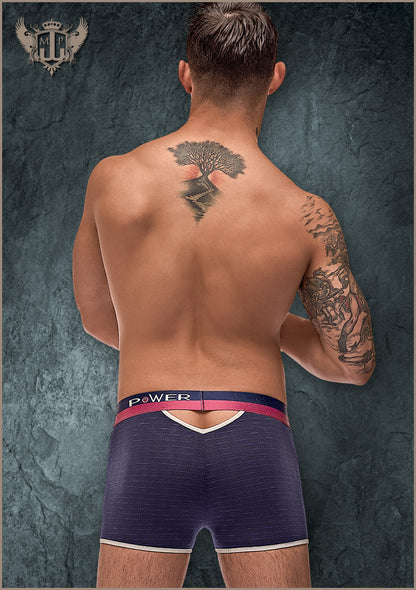 From the French Terry collection by Male Power, this style includes: a short featuring cutout V-shaped windows on the hips and rear, contrast binding, and a newly branded multi-colored elastic waistband.