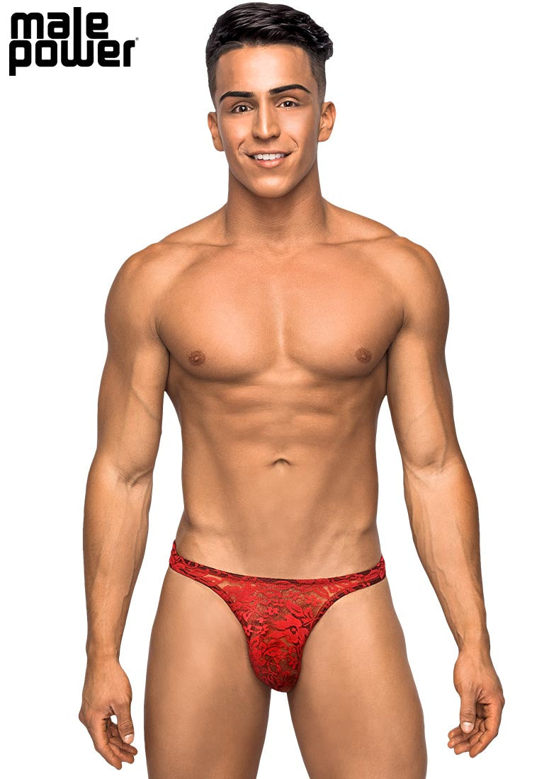 From the Stretch Lace collection by Male Power, this style includes: A lace bong thong featuring a comfort fit pouch and classic one-inch back and sides.