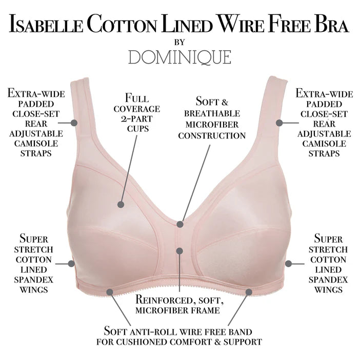 -Your comfort should always come first. With Isabelle, it really does -Wire free bra has a satin like feel that comes from all over breathable cotton -Super comfy, cotton lined, full coverage cups that minimize show through -Wide, cushioned, adjustable, cotton lined comfort straps that feels like a hug -Soft, anti roll under band and leotard back smooth, support and minimize bounce -Isabelle will stay comfortably in place all day and all night -Perfect for those with sensitive skin
