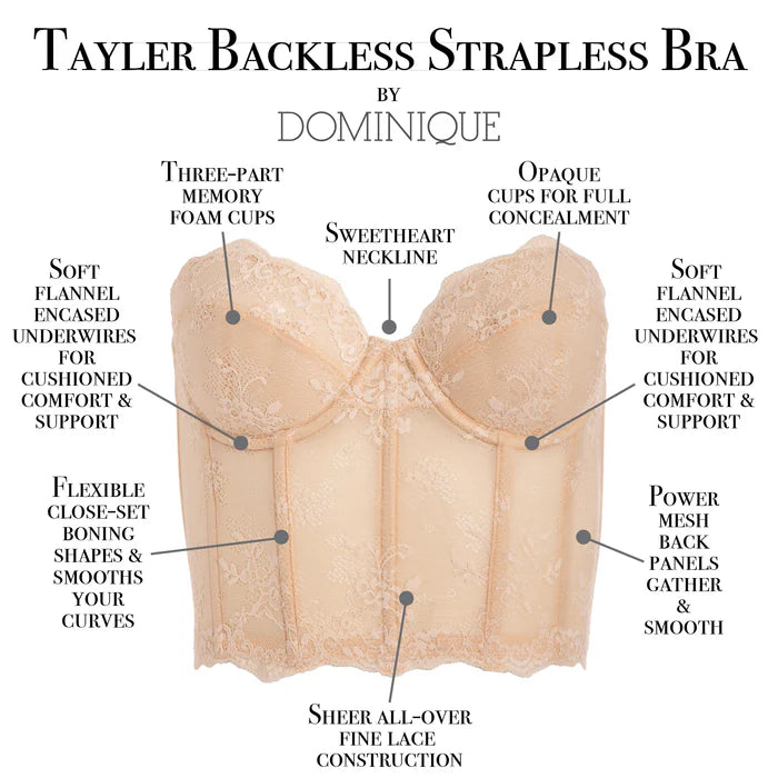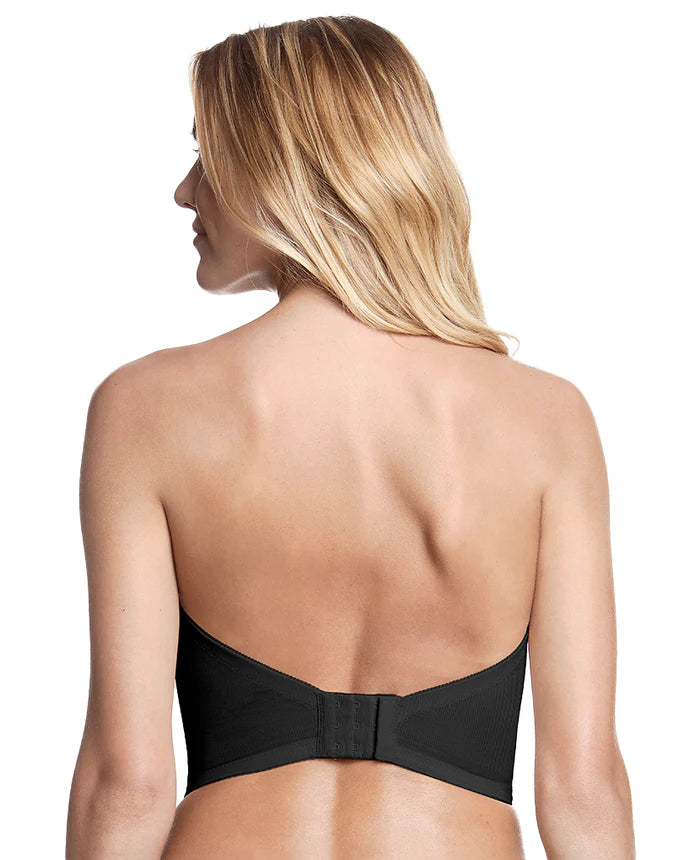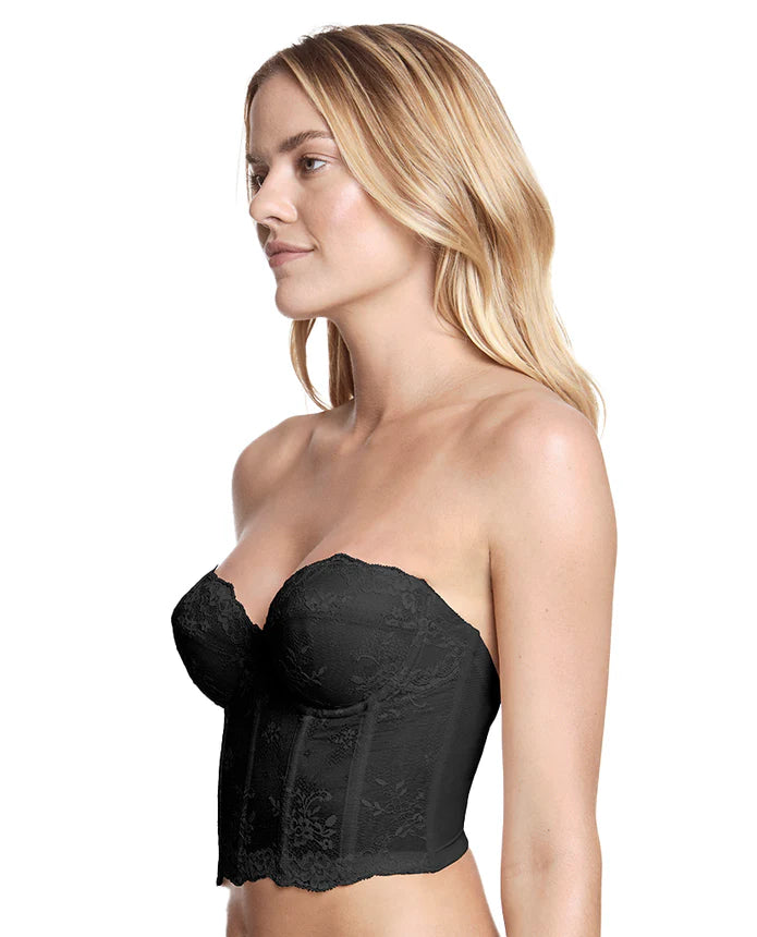 -Combines classic lace design with modern lift and shape functionality -Ultra low back is the perfect solution for strapless dresses and gowns -Light boning smooths and gathers the midsection and sides -Breathable memory foam padded cups and ultra comfort underwires -Stretch Spandex power-net back panel for shaping & support -Slims your curves to create the perfect silhouette -Creates a flawless transition beneath dresses -Padded secure hook and eye rear closure