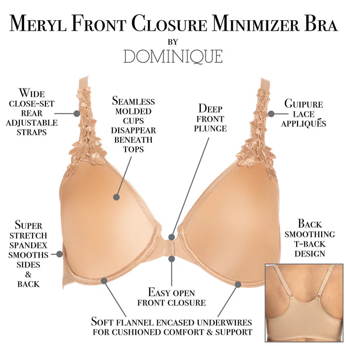 There are front close bras, and there are minimizers. Now the Meryl Front Close Minimizer bra, also a back and side smoother, is truly a unique all in one solution! Slip into your bra conveniently and easily with a unique slide & click front closure. She minimizes, shapes and smooths with a deep front plunge for your lowest cut necklines. Reduce bust line by up to an inch while maintaining and enhancing your natural shape. Ultra comfort & support from plush cushioned underwires and close set straps that prevent slipping and stay comfortably in place. Fully adjustable T-back eliminates bulges and smooths and supports the back and sides. European Guipure lace appliques and fine satin details enhance the luxurious feel.