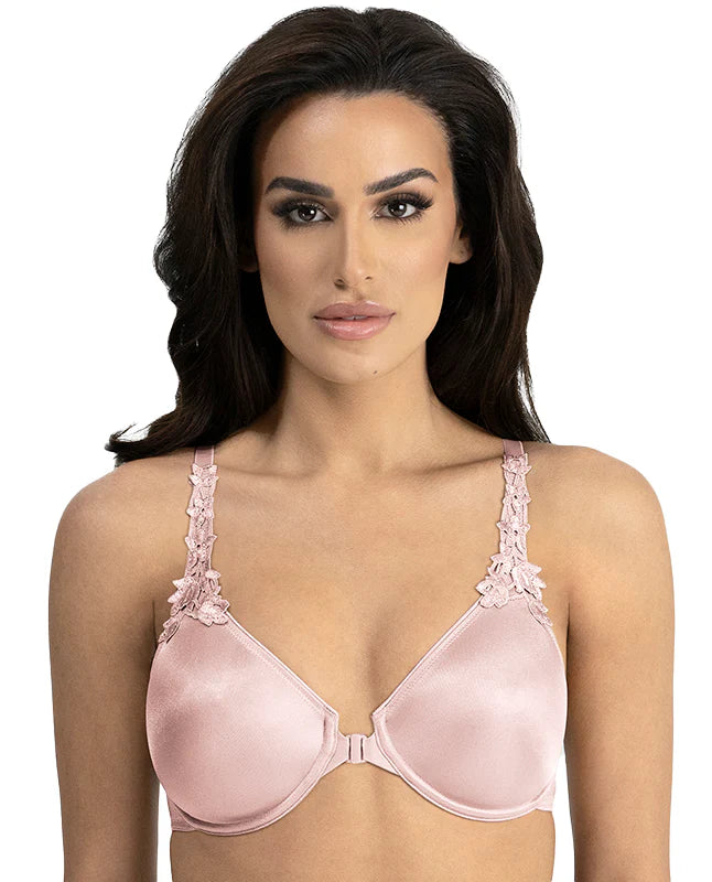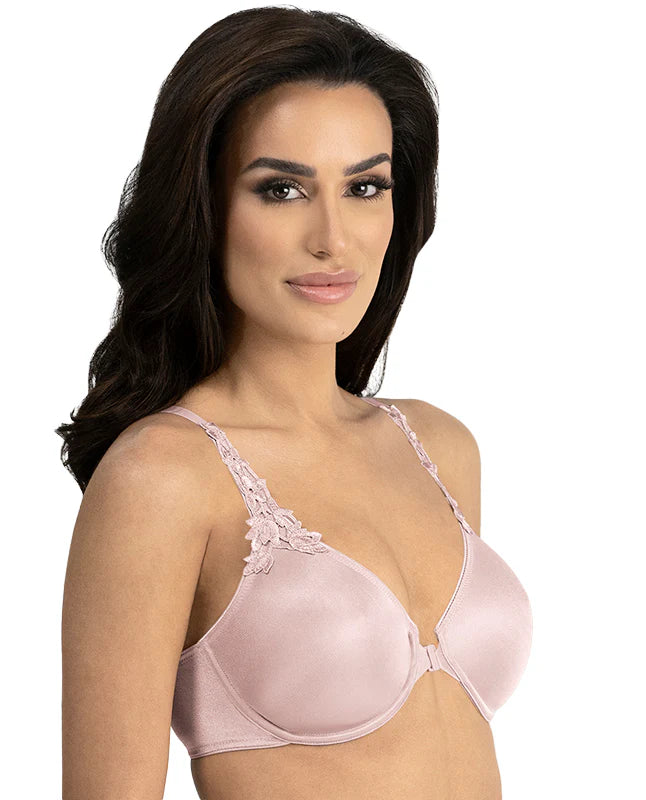 There are front close bras, and there are minimizers. Now the Meryl Front Close Minimizer bra, also a back and side smoother, is truly a unique all in one solution! Slip into your bra conveniently and easily with a unique slide & click front closure. She minimizes, shapes and smooths with a deep front plunge for your lowest cut necklines. Reduce bust line by up to an inch while maintaining and enhancing your natural shape. Ultra comfort & support from plush cushioned underwires and close set straps that prevent slipping and stay comfortably in place. Fully adjustable T-back eliminates bulges and smooths and supports the back and sides. European Guipure lace appliques and fine satin details enhance the luxurious feel.