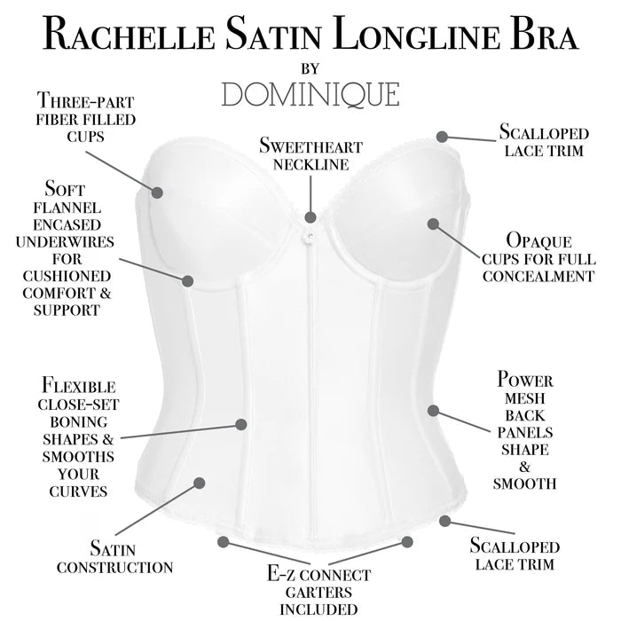 The Rachelle Hip Length Bustier is a modern classic for those with a slightly shorter torso who want the shaping and support under low back strapless gowns and other styles. Crafted of refined all over Satin and edged with delicate lace details and Picot trim, Rachelle is the ideal solution to control, lift, and smooth your silhouette into hourglass shaped perfection. Lightly lined fiberfill cups with 3-part construction provide no-show opacity with exceptional shaping, and lift. The cups are supported by softly cushioned underwires for maximum comfort and are set onto a reinforced Satin bodice with close set Boning which smooths and slims your torso, sides, and back. Spandex power mesh back panels provide snug smooth security, comfort enhanced with soft brushed elastic across the top. Rachelle is an elegant, low back, long line strapless bra that can be worn as a trendy, worn-to-be-seen bustier. She creates a flawless transition under clothes. Adjustable, detachable garters included. Secure hook and eye back closure.
