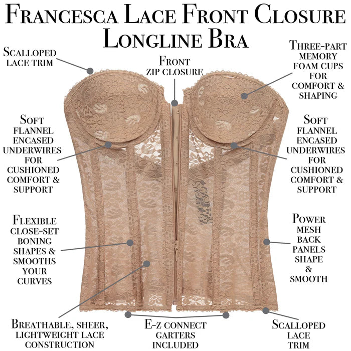 Discover the effortless convenience and comfort of the Francesca longline bra - featuring a concealed hook & eye front with an ultra-smooth zip closure. Crafted from luxurious floral lace, and the latest in innovative design, this strapless bra provides exceptional support, shaping, and smoothing. The low back strapless design is both modern and breathable, perfect for wear under sheer dresses and tops. With 3-part memory foam cups, comfortable underwire support, and close-set boning, Francesca delivers the perfect silhouette, and a touch of elegance and femininity. Experience the ultimate in comfort and style! Adjustable, removable garters included.