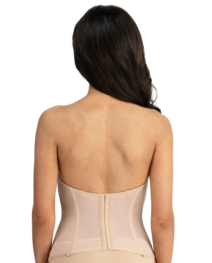 -Low back strapless design with a sweetheart neckline -Opaque, soft, innovative, fine gauge microfiber construction -Both ultra-modern and breathable, yet sophisticated and stylish -New, modern, three-part memory foam cups offer complete concealment -Comfortable underwire support to keep you completely secure -Flexible, close-set boning shapes and smooths your curves -Waist length smooths and supports the lower back & covers slip seams -Luxurious fabrics, materials and components -Secure, padded, hook and eye rear closure -Matching detachable, removable garters included