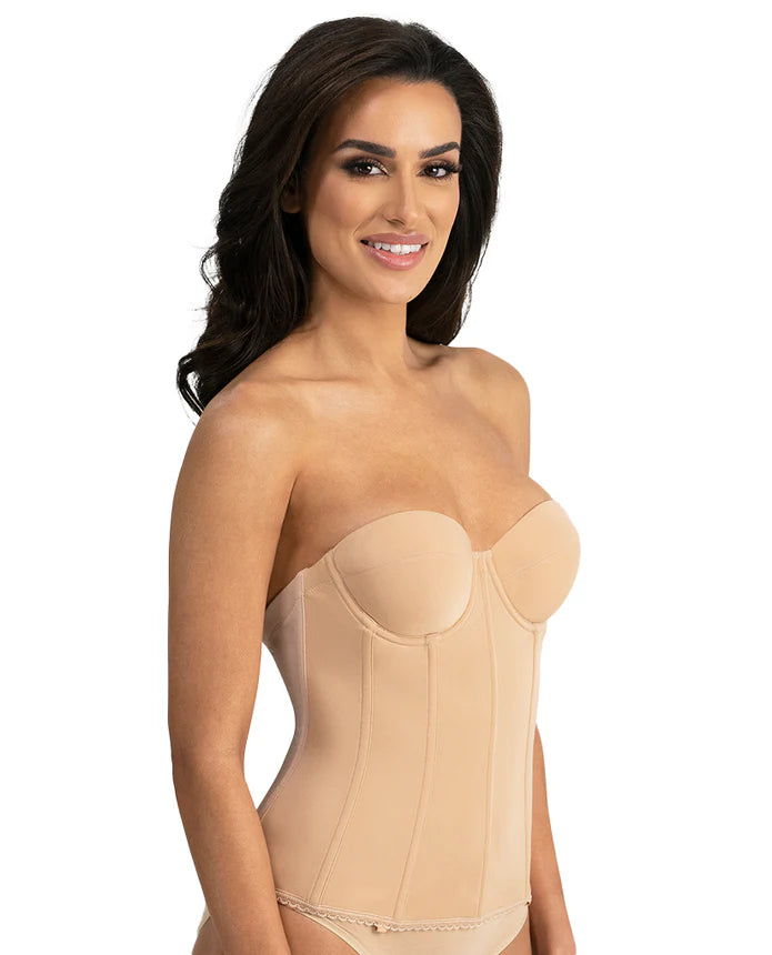 With its soft, innovative, fine gauge microfiber construction, and hip length, the Brianna Low Back Strapless Longline Bridal Bra combines classic styling with the newest, most luxurious fabrics, materials, and components to provide exceptional smoothing, support, shaping and comfort. Offering a low back strapless designs with a sweetheart neckline, Brianna is both ultra-modern and breathable, yet sophisticated and stylish under dresses or tops, and perfect for Worn-to-be-seen. Our newest color Mocha has been an instant hit and becomes almost invisible next to most skin tones. New, modern, three-part memory foam cups hold comfortably and offer complete concealment. The cups and body are super breathable and combine with comfortable underwire support to keep you completely secure. Flexible, close-set Boning shapes and smooths your curves for the perfect silhouette. Secure, padded, hook and eye rear closure.