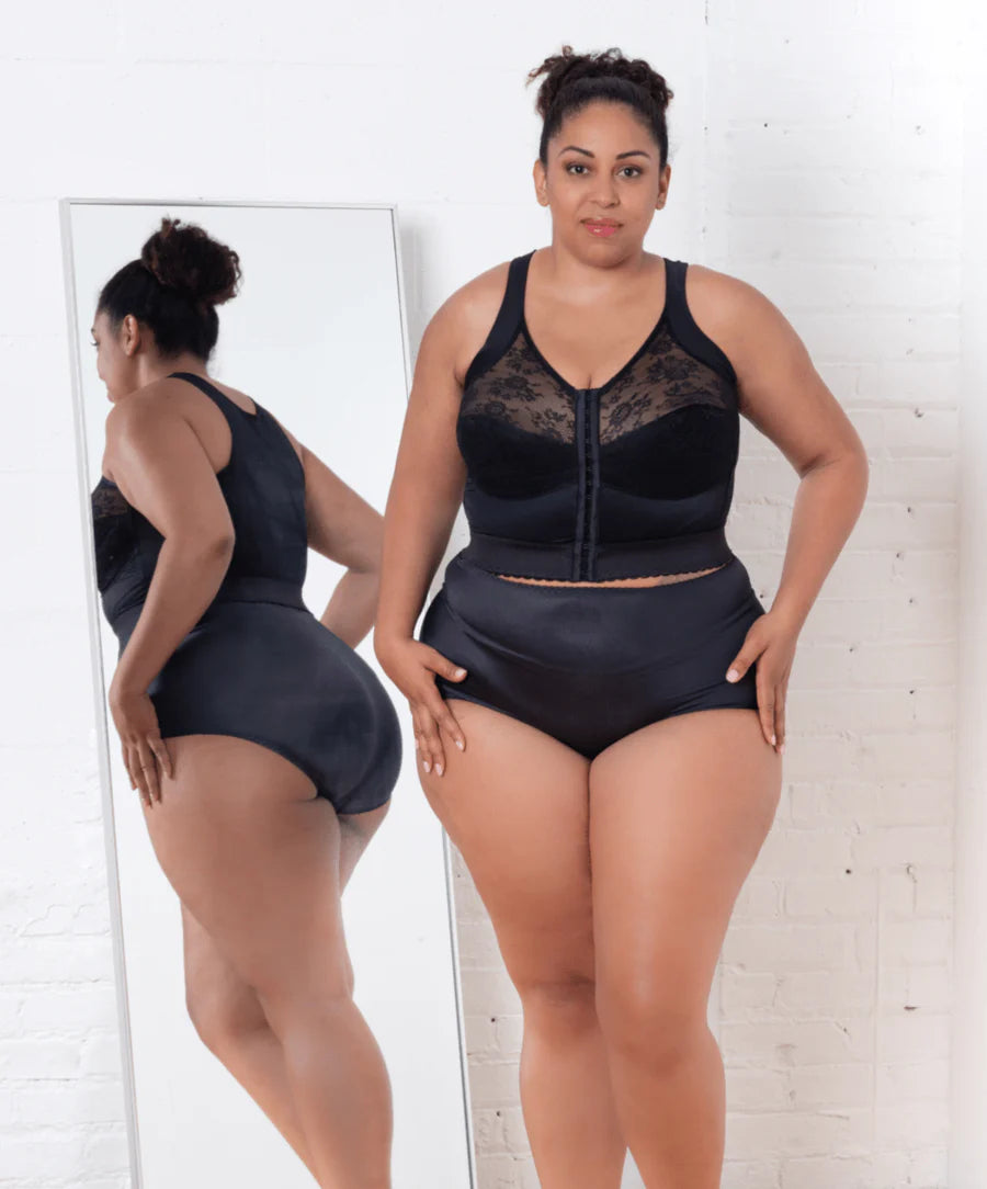 Longline bra offering soft cups with front closure. Designed with Special Supportive Bands to promote better posture and to provide relief to the upper and lower back. Wide straps to relieve shoulder strain. Wide anchor band for added stability. Moderate Support Level. Body: 83% Nylon, 17% Spandex. Cups: 50% Nylon, 50% Polyester.