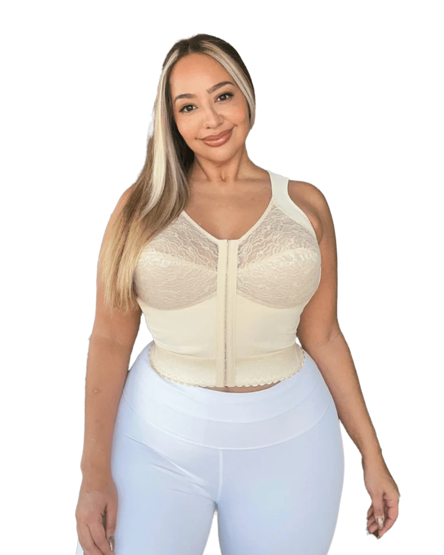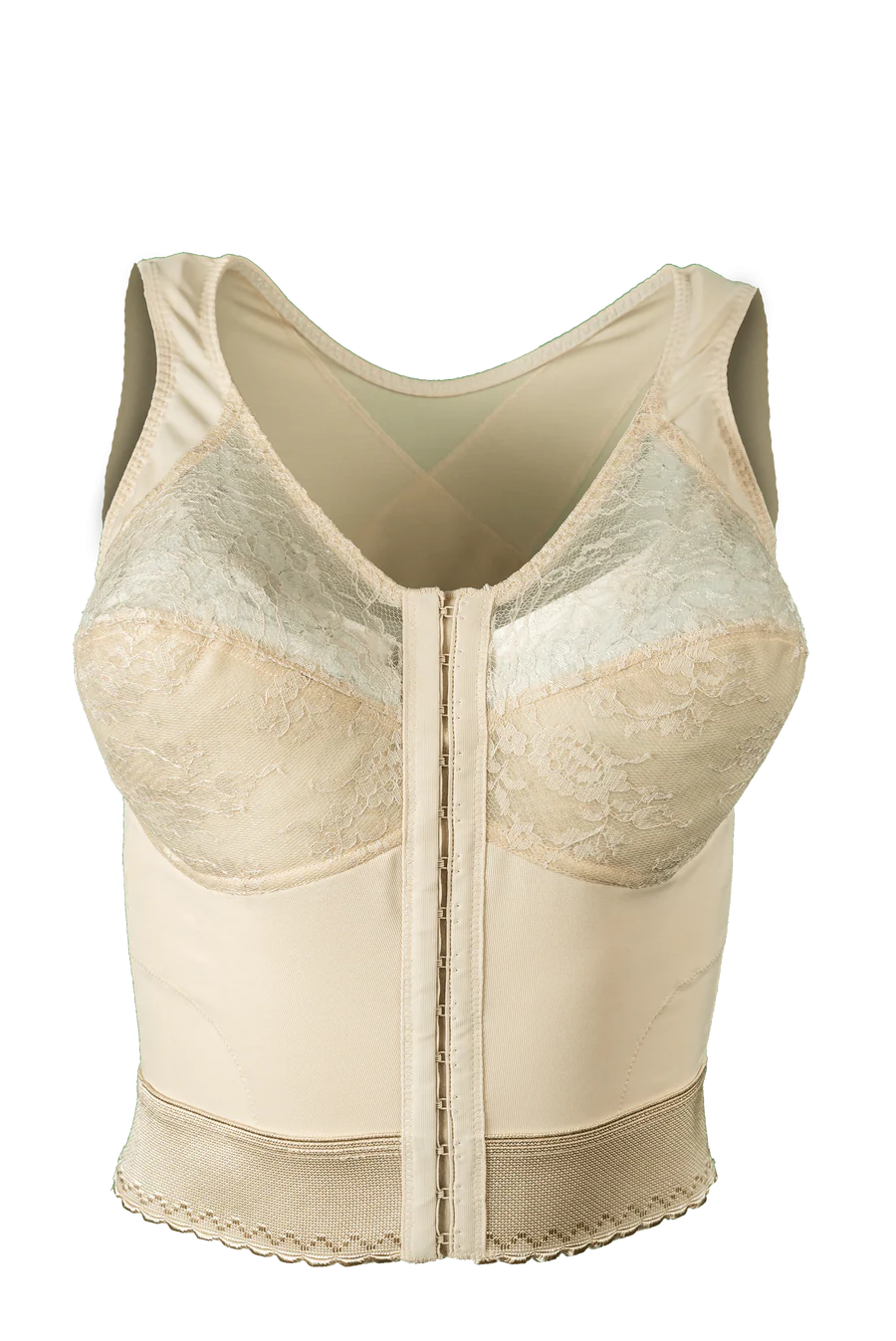 Longline bra offering soft cups with front closure. Designed with Special Supportive Bands to promote better posture and to provide relief to the upper and lower back. Wide straps to relieve shoulder strain. Wide anchor band for added stability. Moderate Support Level. Body: 83% Nylon, 17% Spandex. Cups: 50% Nylon, 50% Polyester.