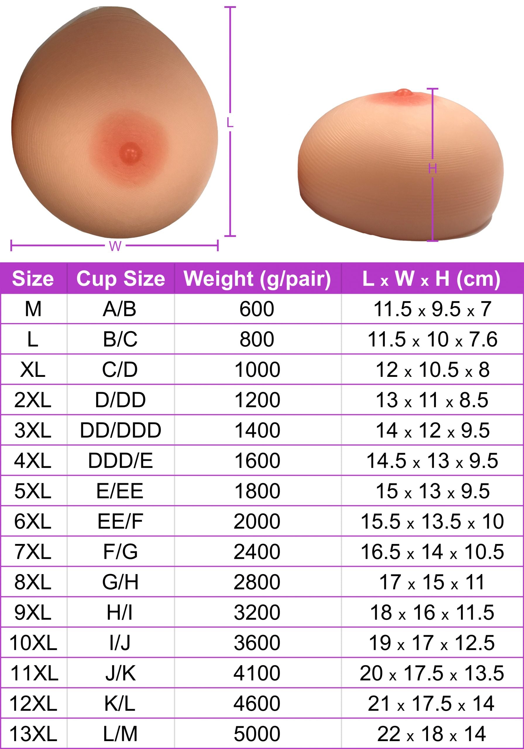 ENVY BODY SHOP Big Jugs Fuller Rounder Tear Drop Silicone breast forms. Used for mastectomy purposes, for cross dressing/transgender use, cosplay, or to increase your size dramatically. ENVY BODY SHOP Rounder Fuller Concave Back Tear Drop Silicone Breast Forms were for person that already have some breast tissues, but are also suitable for flat chested people. These work especially well for men that have “man-boobs”, So if you have “man-boobs” or if you have breast tissues from HRT or if you are a female with small breasts and want a larger cup size, ENVY BODY SHOP Rounder Fuller Concave Back Tear Drop Silicone Breast Forms will be perfect for you. It will enhance your size significantly. ENVY BODY SHOP Rounder Fuller Concave Back Tear Drop Silicone Breast Forms are super soft so that they contour your existing breast tissue confortably. You can also use Hollister medical grade spray on glue on them to create stickiness. Bra sizes we stated that fit each silicone breast forms does not mean it is exactly the size for each individual; it is a general guideline. For example, if you want to achieve size G/H, it does not mean you pick size G/H CUP breast forms. One person wearing size G/H can be a G cup but the other person an F cup. If you have questions on finding the best fit product please tell us what is your height, weight, chest size and also the result you want to achieve so we can find you the best fit size. If you are looking for big silicone breast forms that without concave back you can check out ENVY BODY SHOP EXTRA LARGE SILICONE BREAST FORMS