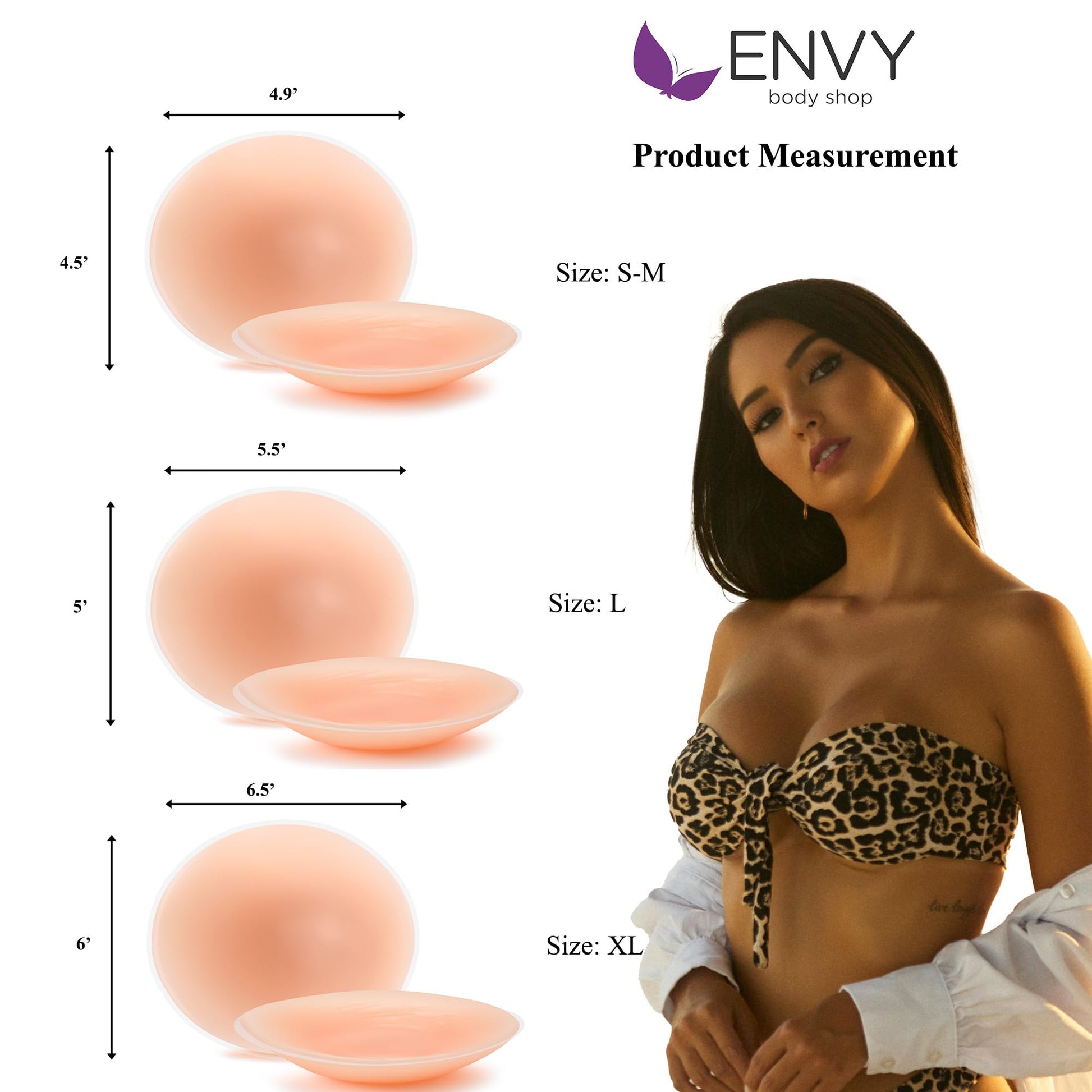 Enhance your bust size or smooth out your breasts after lumpectomy with the lightweight silicone Envy Body Shop breast pad and lumpectomy enhancer. The concave shape will adapt to your chest for a more even look. It is symmetrical and can be worn on either side of the body. Hand washable. Get the lumpectomy enhancer if lumpectomy has left you smaller on one side or the other. Lumpectomy Enhancer Breast Pads Sizes Size Small/Medium (Cup Size A-B) 4.9" x 4.5" Size Large (Cup Size C) 5.5" x 5" Size X-Large (Cup Size D) 6.5" x 6"
