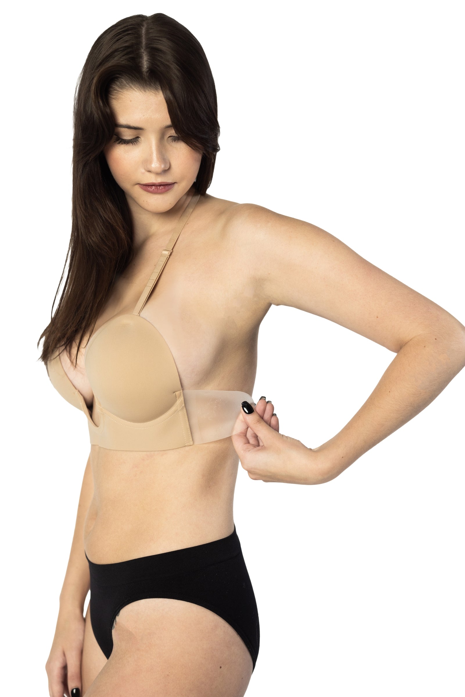 Wear a backless dress with comfort and confidence with this Plunging Backless and Strapless Bra. Stick on your body and adjust your cleavage with the adhesive wings. Resusable if properly cared for and covered with the original plastic when not in use. Strap can be removed for a strapless look. Not to be used on sensitive or sunburnt skin Do not sleep with or wear overnight Adjust as many times to get the best fit and comfort