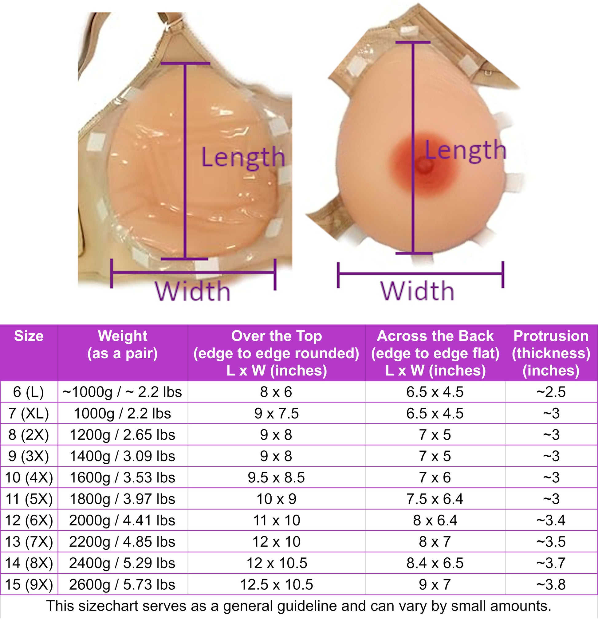 This Envy Body Shop silicone breast form with bra combo provides form and function into one. The silicone breast forms combine with the bra using velcro when sticking through the hole in the bra. The bra attaches at the back to provide comfort and support. Bra provided will either be beige or black and chosen at random. If you have a preference, please call after placing an order and ask for a specific color. Silicone Breast Form with Bra General Size and Fitting This is a general guide and your needs may differ. Please contact us and we will help you find the right size for your ideal fit.