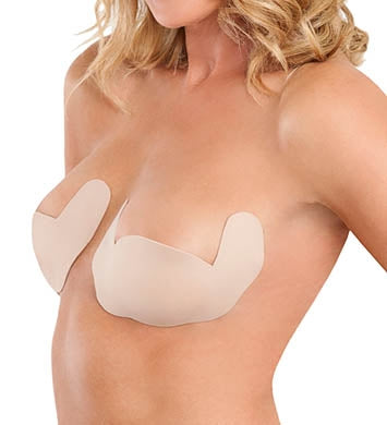 The boosting support bra for backless and strapless wear. You can wear the ultimate boost adhesive bra up to 6 times with proper care. It is required that you wash your breast area thoroughly. Do not use any soaps with oil or moisturizers. Rinse skin completely of all residues and dry thoroughly before application. Do not use powders, moisturizers, oils or fragrances anywhere near the breast area prior to applying the Ultimate Boost adhesive bra. Instructions for Applying the Ultimate Boost Adhesive Bra Step 1: Peel away the backing from the adhesive crescent. Gently hold the edges of the bra with fingertips. Step 2: Without allowing the nipple to touch the adhesive, lean forward slightly, allowing your breast to be positioned naturally in the center of the bra. Step 3: Simply smooth on the tape by patting lightly with fingertips. Start in the lower middle of the breast working your way up and around the entire breast. Step 4: Repeat steps for the other breast. When Removing: Peel the bra off gently while holding your skin. This allows the silicone to peel off more easily. If any silicone residue exists, use baby oil to remove. Care Instructions: Hand wash adhesive with mild soap and water after each wear. Let the adhesive air dry. Silicone is rejuvenated for additional wears. Do not machine wash or dry. Replace plastic protective paper on each cup when storing product. 84% nylon, 16% spandex Silicone adhesive inside cups Padding is 9/16" thick and tapers to 1/16" thick Center front of each cup is 3-1/2" tall Comes in one pair and in nude color only
