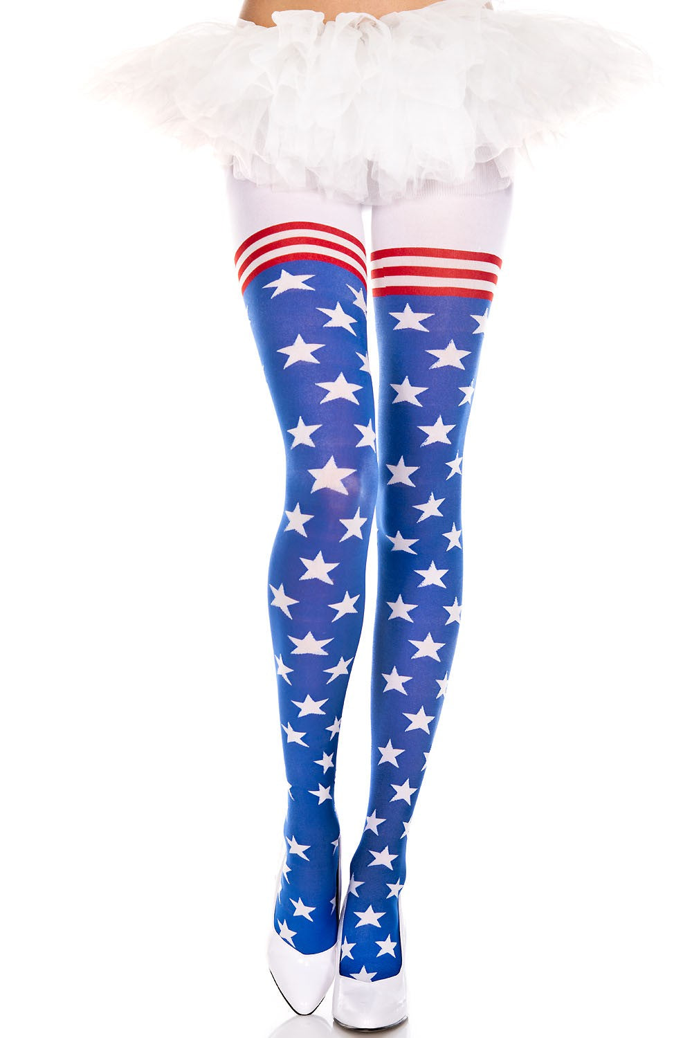 Flag print pantyhose. Available only in the red, white, blue pattern as shown and in one size. 88% nylon, 12% spandex.
