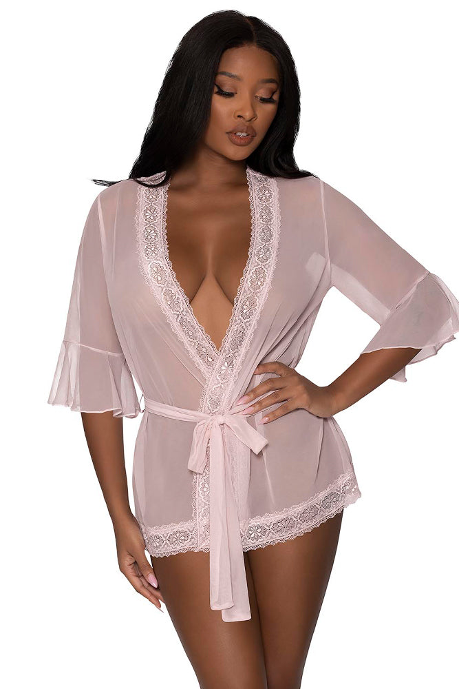 From the Exposed by Magic Silk collection, this style includes: a flowy, thigh length robe featuring breathable mesh trimmed with lace, fluttery bell style mid-length sleeves, with a matching stretchy mesh belt.
