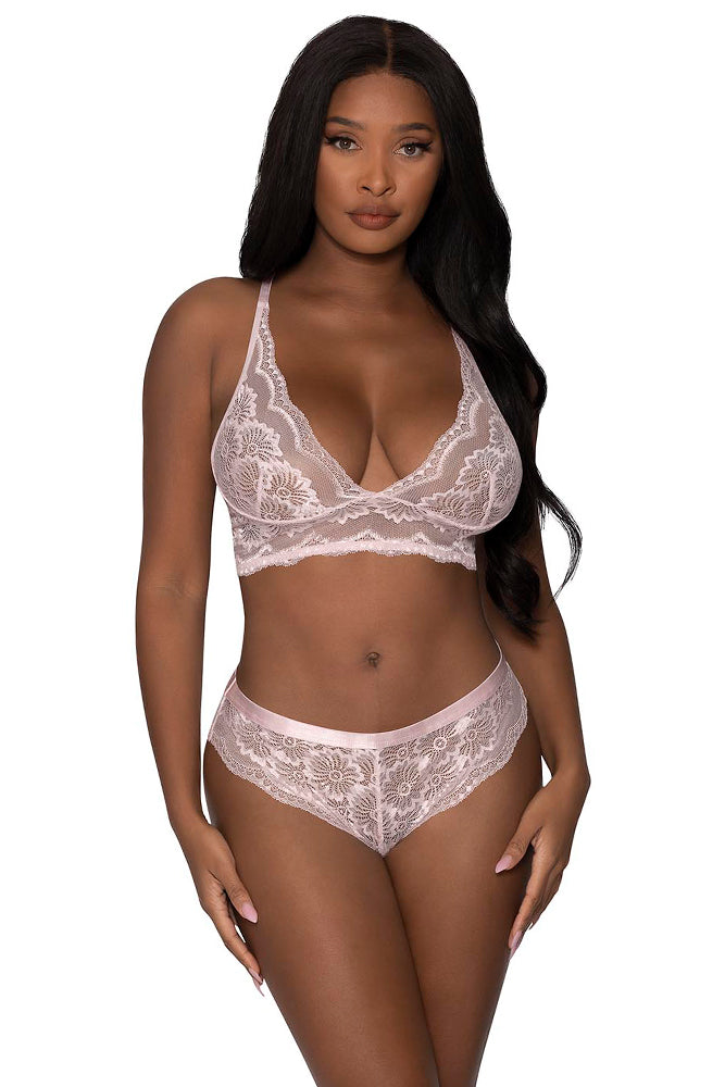 From the Exposed by Magic Silk collection, this style includes: a lace bralette featuring, djustable shoulder straps with blush tone sliders, a strappy back design with with a blush toned o-ring, swan hook closure in the back, and a matching lace short featuring a ribbon-like strap.
