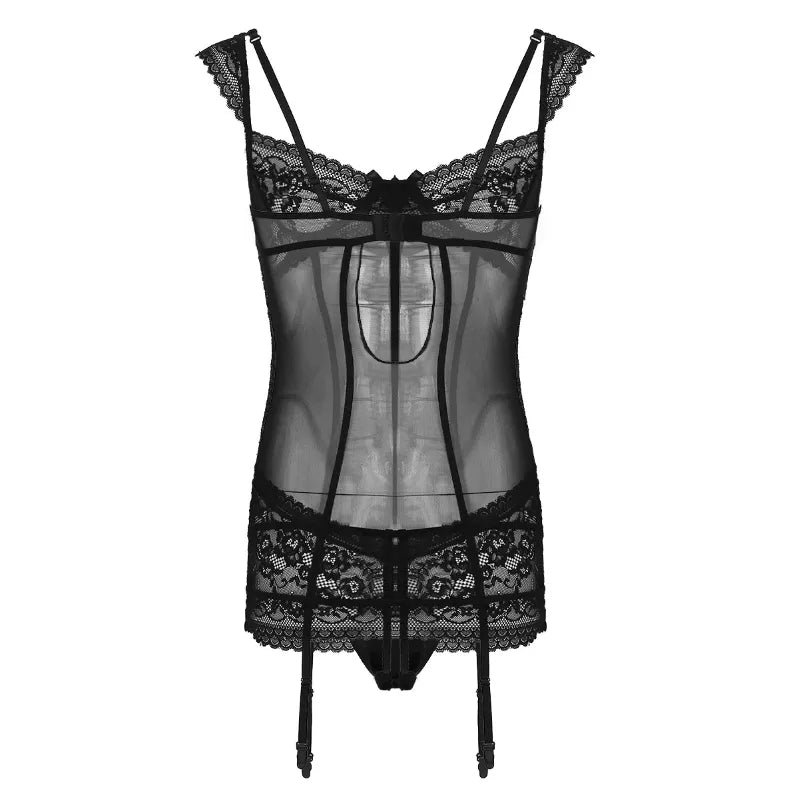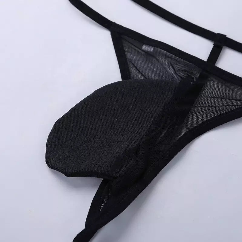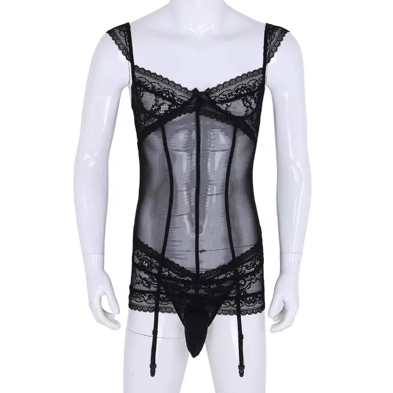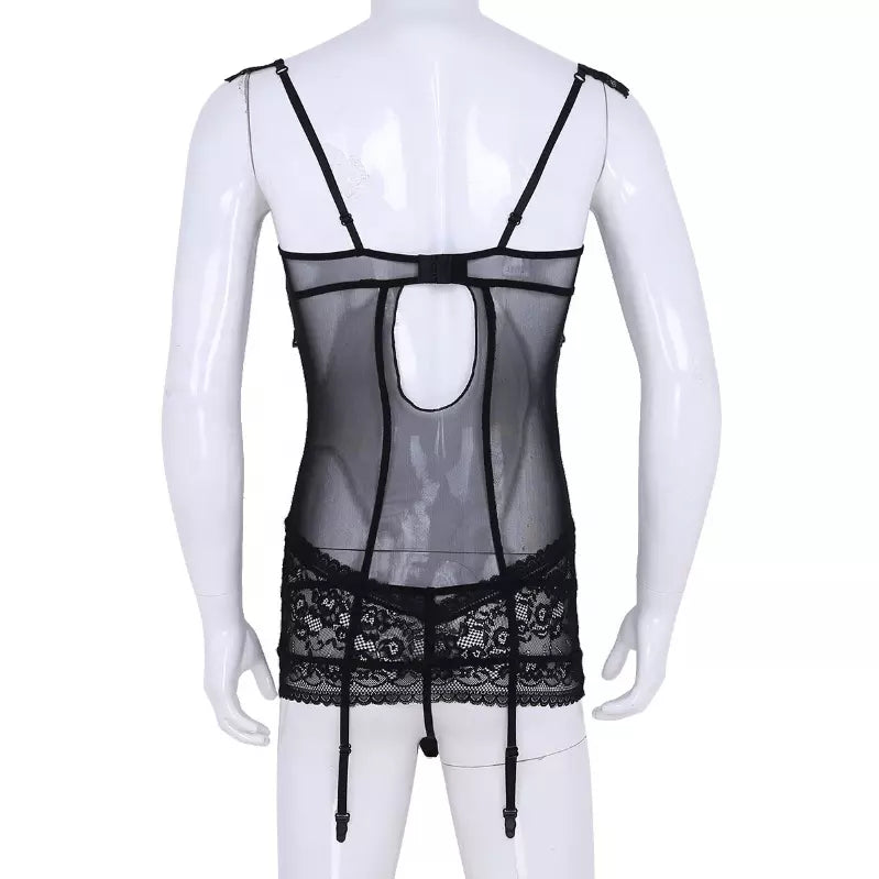 Men's crossdress bodysuit lingerie set, slim fit and good stretchy fabric. Sleeveless with adjustable spaghetti straps mini dress, no pad bra, 4 garter straps with clips. Cut out back with 3 rows hook and eye closure, lace floral detail. G-string with front bulge pouch for good surport. Super soft and comfortable to wear, see through design, perfect for lingerie night or self-pleasure.