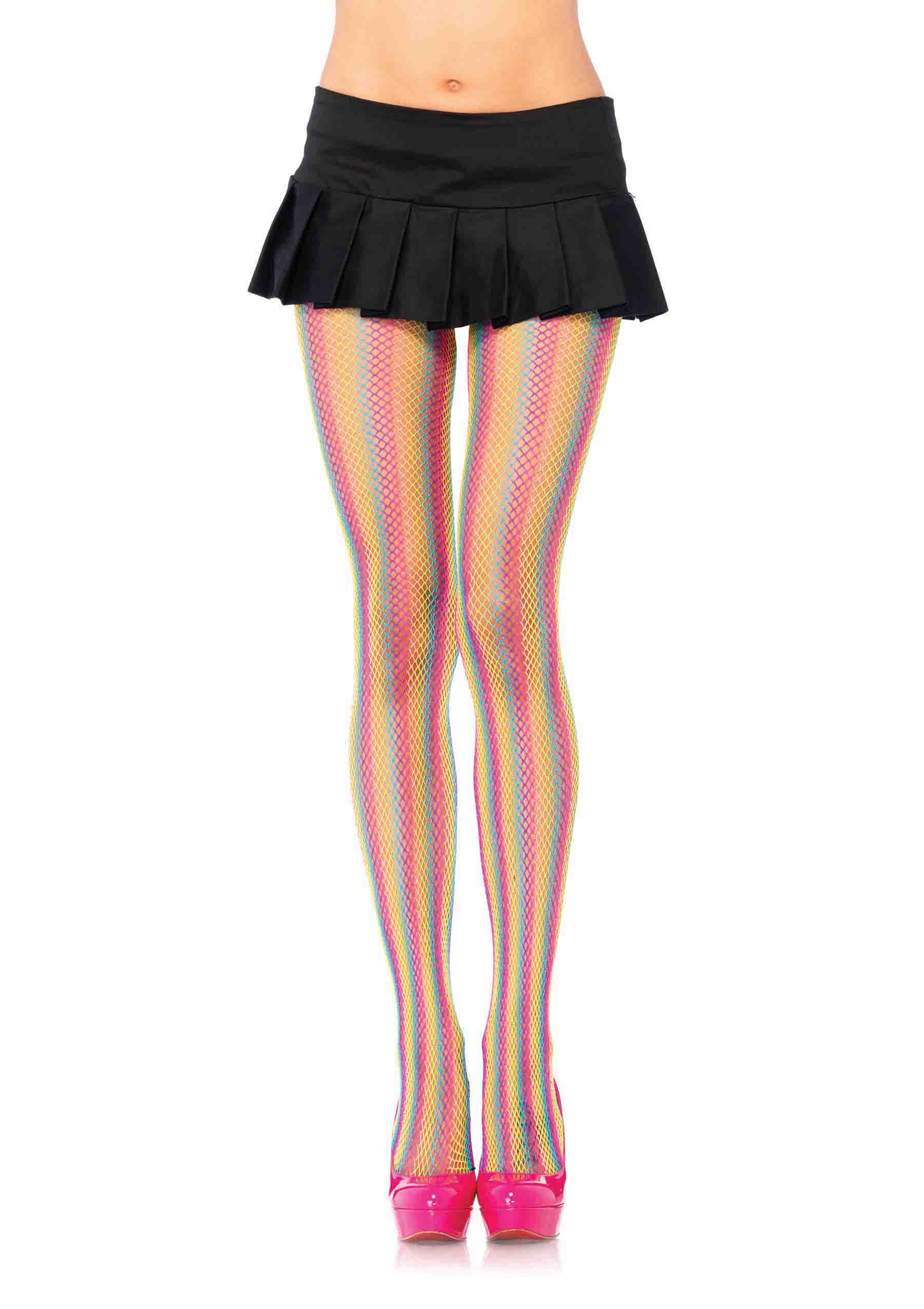 Neon rainbow stripped fishnet pantyhose. One Size. 93% NYLON 7% SPANDEX