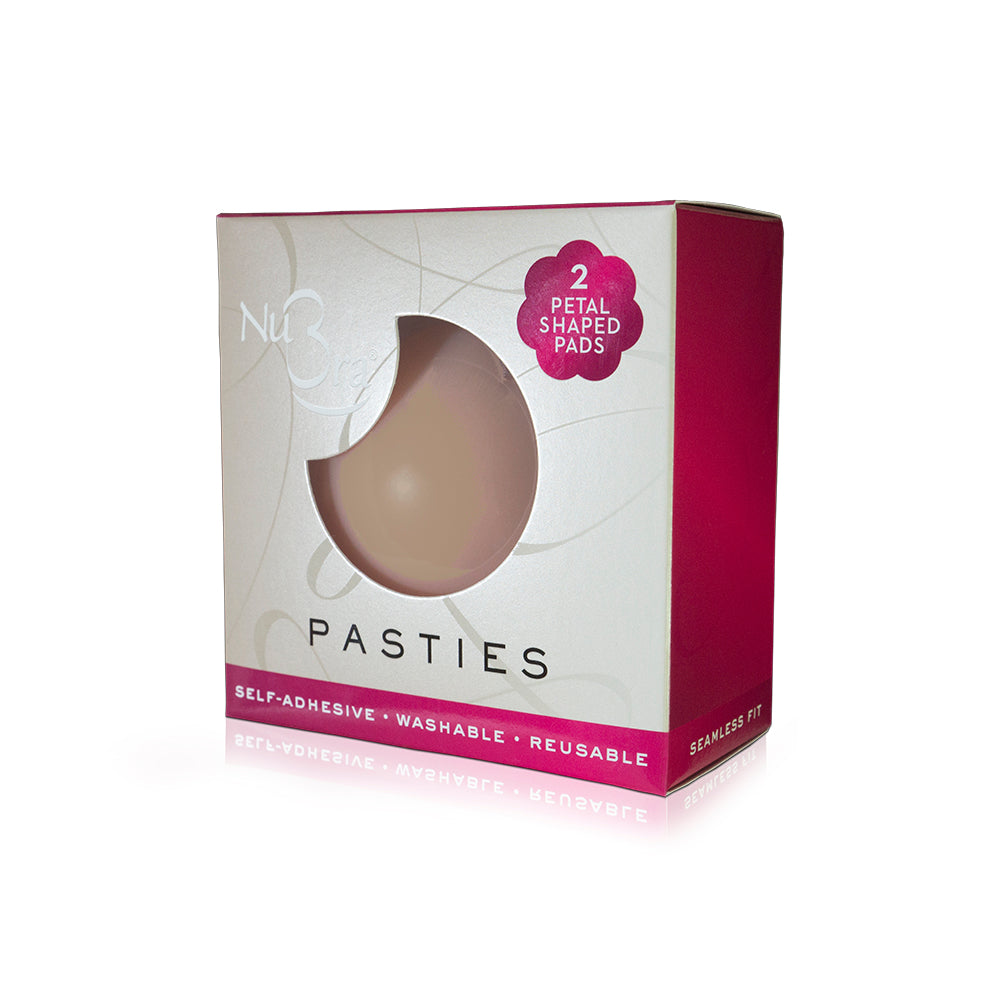 Self-adhesive nipple covers. Made of soft silicone for a comfortable, seamless fit. Adhesive is only on the inside of the pasties, so the pasties will only adhere to the skin and not to the clothing. Large Pastie dimensions: 4.13" x 4.25" x 0.25" NuBra Women's NuBra Self Adhesive Pasties Made in USA. Package comes with one pair of pasties of the same size. Materials: Silicone and Polyurethane